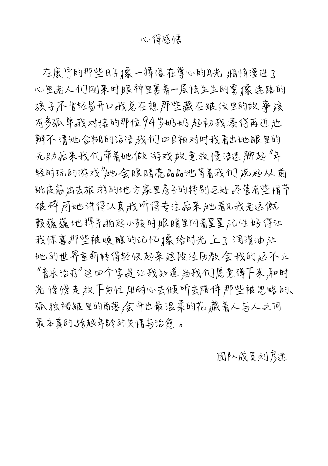 后续,团队将总结本次怀旧式音乐治疗的经验,进一步优化互动方案——比如结合不同年代老人的成长背景细化音乐分类,增加乐器体验、集体合唱等更具参与感的环节。同时,在未来,我们计划将实践数据与专业医疗机构共享,探索“音乐治疗+常态化关怀”的长效模式,让怀旧旋律持续为更多老人的心理健康注入能量,也让青年力量在守护老年康宁的道路上走得更稳、更远。