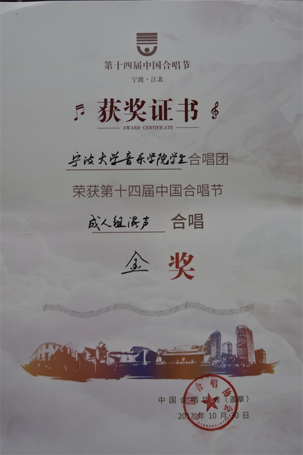 合唱团,在本次比赛中脱颖而出,获得成人混声合唱组金奖,列组内第二名,薛南老师获得“优秀指挥奖”。优秀指挥奖在141名指挥中角逐,共选9名。