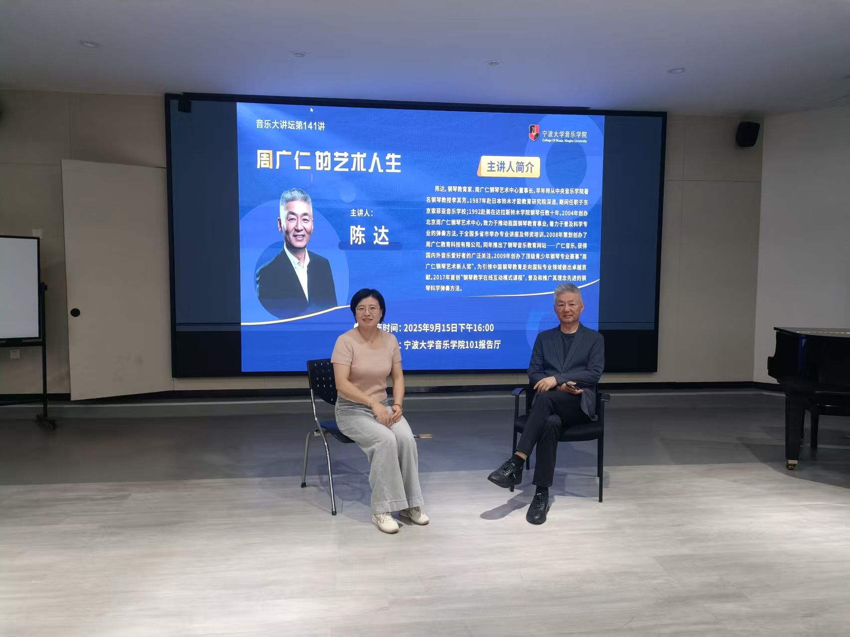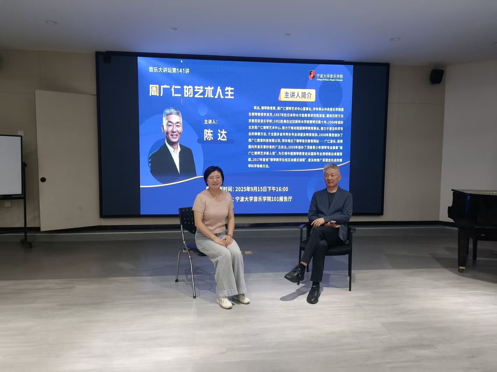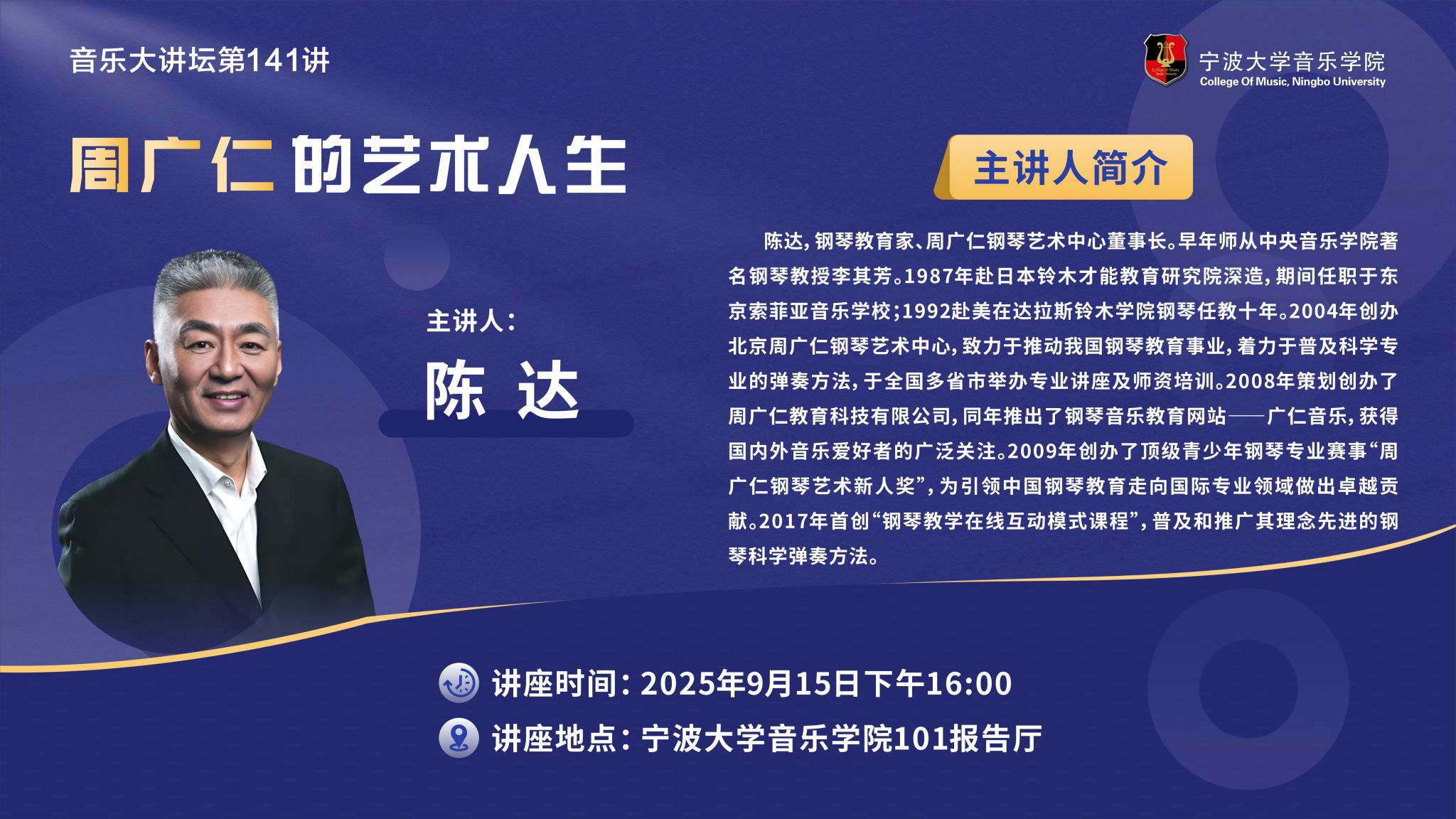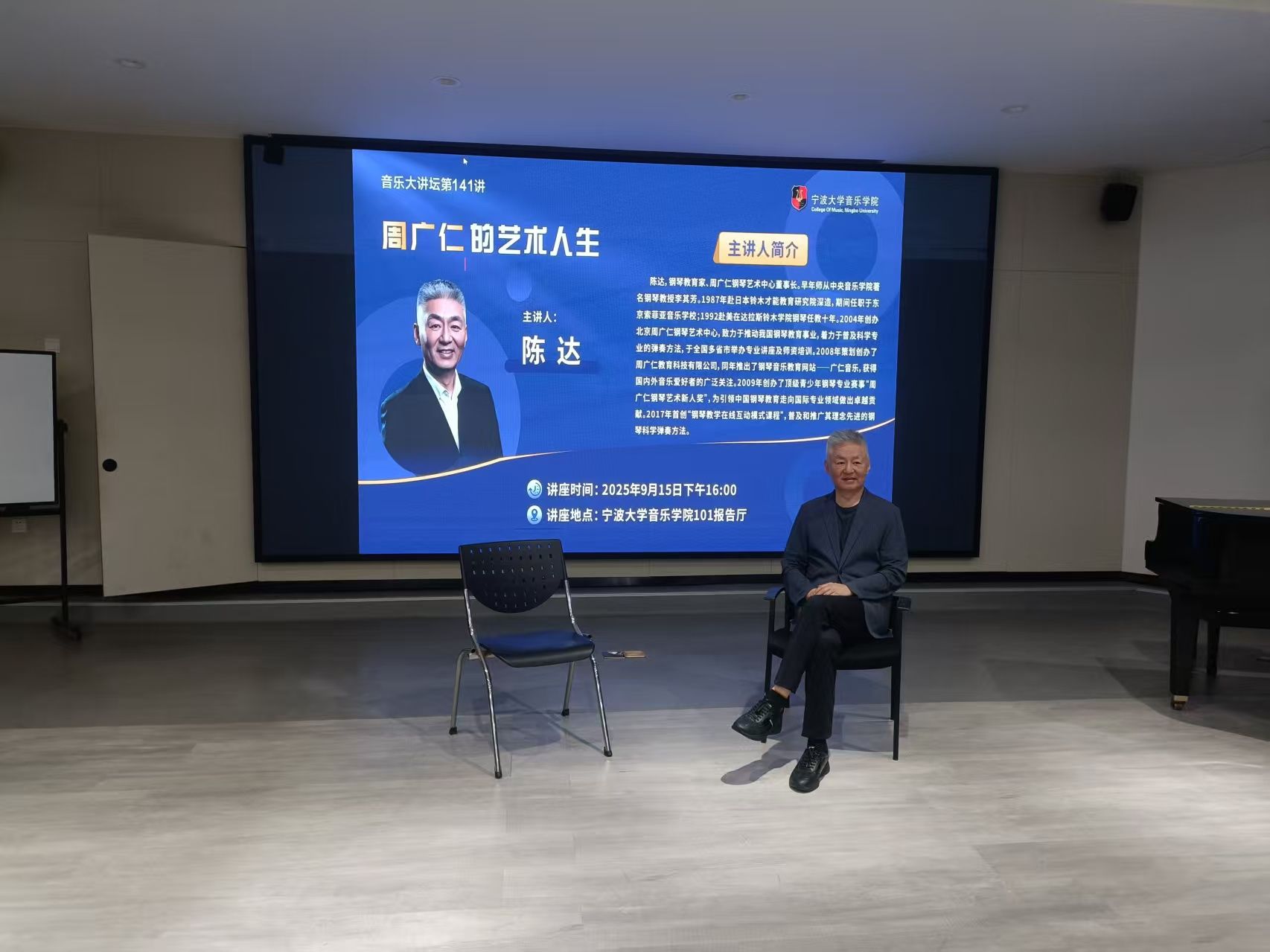 邀请钢琴教育家、周广仁钢琴艺术中心董事长陈达做客音乐大讲坛第141讲,为学院师生做题为《周广仁的艺术人生》的学术讲座。陈达,钢琴教育家、周广仁钢琴艺术中心董事长。早年师从中央麻豆在线