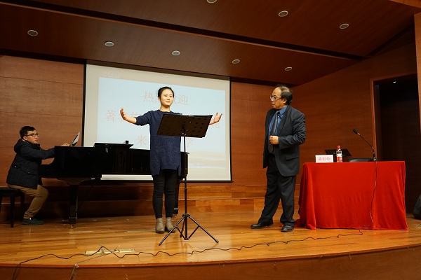 进行的大师班讲座气氛热烈,讲座内容生动有趣。讲座内容主要有:结合自身学习声乐及音乐的经历,以及多年旅美的经验,与在场师生进行交流;对学生和老师的演唱进行了详尽的指导。岳彩轮教授提到,近年来越来越多的亚裔演唱家实力雄厚,在世界上享有盛誉,这与多年来音乐教育的进步是密不可分的。岳彩轮教授结合自身在美国的经历,从求学、治学等方面谈了自己的感受。他用生动幽默的言辞,将自己多年来对于音乐的热情和执着,求学阶段风雨无阻的坚持,以及严谨的治学作风进行了详尽的讲述,感情真挚感染着在座的听众。