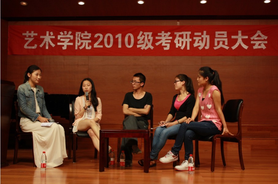 6月14日下午,我院2010级考研动员大会暨“艺苑青年成长论坛”第七讲——“我们的考研之路”优秀学子考研经验交流会在小音乐厅举行。