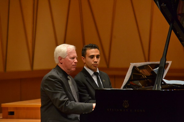 两位美国钢琴家为观众们精心挑选了异彩纷呈的音乐作品,上半场是耳熟能详的古典钢琴音乐作品,让听众们徜徉在西方音乐的历史长河中;下半场则是美国爵士钢琴音乐的盛宴,也由此掀起了本次音乐会的高潮。勃拉姆斯的《华尔兹组曲》在约翰·塞尔文和安东尼奥·特鲁奥斯的共同演绎下,顿时变得生动起来。高音区的清脆细腻,低音区的深沉柔美,在他们的指尖下仿佛展现了一幅幅美丽动人的舞蹈场面,一支黑白键上的华尔兹舞映入眼帘。而一首《白发》作为安东尼奥·特鲁奥斯献给老师约翰·塞尔文的爵士作品,塞尔文幽默的出场方式、师徒二人时而站立时而坐下、双足随着音乐敲击地面的声响等即兴表演,吸引了观众的注意力,也博得了观众们的欢呼与赞叹。同时,这种看似随性的演奏方式在展现他们默契与信任的同时,更让观众们感受到了美国爵士音乐的无穷魅力。动情之处,特鲁奥斯会默声唱着歌词;曲终时,两人顺势将手交织于键盘上,并相视一笑,仿佛让观众们体会到了演奏所带来的内心愉悦和满足感。而两位钢琴家对《浏阳河》、《采茶扑蝶》、《翻身的日子》这三首中国作品的全新诠释,令在场的观众无不拍手叫好。(廖松清)