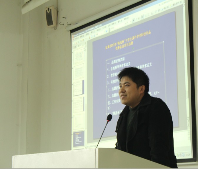 学院艺术设计系许雯老师在会上作了动员,她分析了科研对学生成长成才的意义,并传达了学校于2011年推出的一系列科研激励政策,希望全体学生都能积极投入到学生科研工作中来,促进自身各方面能力的发展,介绍了学生创新创业体系以及与学院相关的创新创业训练项目,并通报了近期学生科研工作安排。校团委周星宇老师给大家作了如何开展“挑战杯”全国大学生课外学术科技作品竞赛课题申报和课题研究的指导,他强调要遵循15字选题原则即“针对大背景,着眼小领域,解决真问题”,并针对哲学社会科学类课题的申报,有的放矢地提出了宝贵的建议和意见。