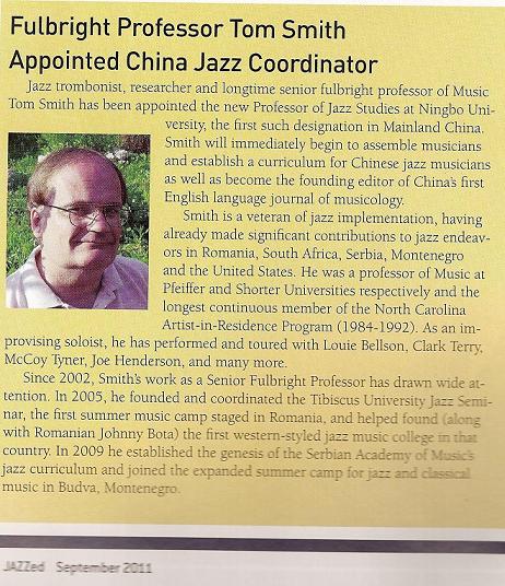 美国著名爵士音乐教育杂志 《Jazzed》 在最新出版的一期上报道了我院聘请美国富布莱特学者Tom Smith 来学院任教,开展中国第一个爵士音乐项目,以及进行国际化音乐学研究的消息。
