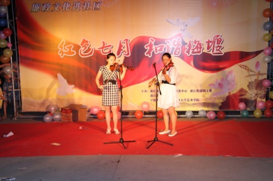 7月18日晚7点,江北区甬江街道梅堰社区的新文化广场上,人头攒动,琴声悠扬,一场精彩的以“红色七月,和谐梅堰”为主题的纳凉晚会正在这里举行,吸引了众多居民驻足观看,为这炎炎夏日吹起一阵和谐、文明、温馨的清风。校团委书记周青、商学院党委书记熊德平、我院党委副书记叶春桥等领导在街道、社区相关负责人的陪同下观看了晚会。