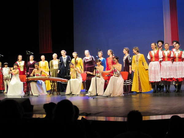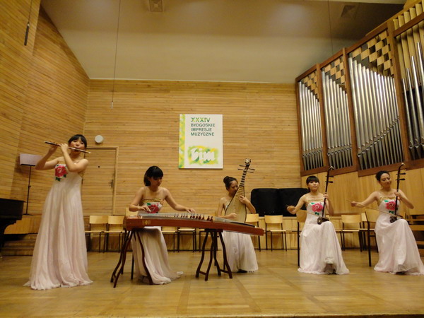我院学生艺术团女子民乐组合由音乐系的杜玲窕(琵琶)、孙亚妮(古筝)、李思捷(笛子)、成沄岫(二胡)、韩柯菁(二胡)等5名同学组成,她们在院长喻辉教授带领下前往波兰参赛。在音乐节期间,她们克服了时差、语言、生活习惯等方面的困难,共完成了包括比赛在内的六场演出,每场演出都获得了当地观众的称赞,引起了彼得哥什市民对中国文化和中国音乐的极大热情。她们的演出成为了此次国际音乐节的一大亮点。当地电视台、电台、报纸等媒体都对我院女子民乐组合在彼得哥什的演出和日常活动进行了跟踪报道。