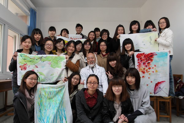 据悉,斋藤光弥教授于3月28日来我校访问交流,期间还应邀为我院08级服装设计方向的学生上了一堂“织物的染绘技法”课。课上斋藤教授对当前日本前沿的纺织染料着色剂的使用方法进行了说明和检验。授课中斋藤光弥教授还进行了具体示范,并和同学们分组完成了一件作品。