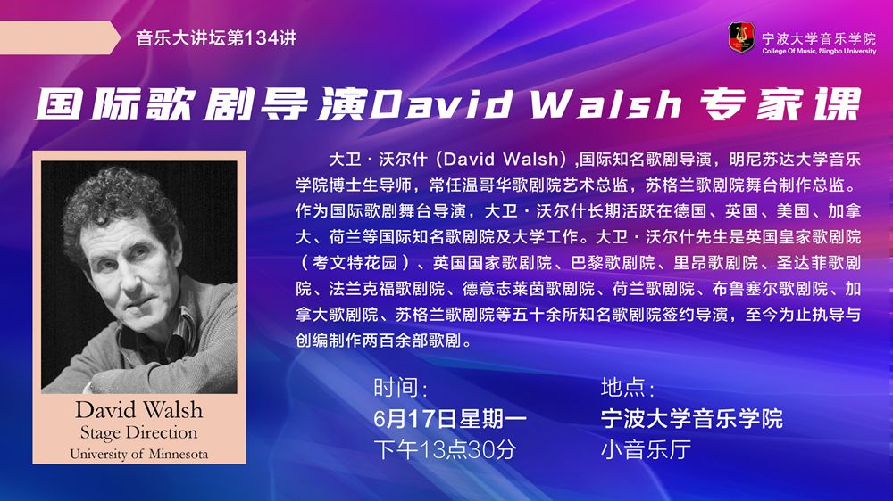 主讲人简介:大卫·沃尔什 (David Walsh) ,国际知名歌剧导演,明尼苏达大学麻豆在线