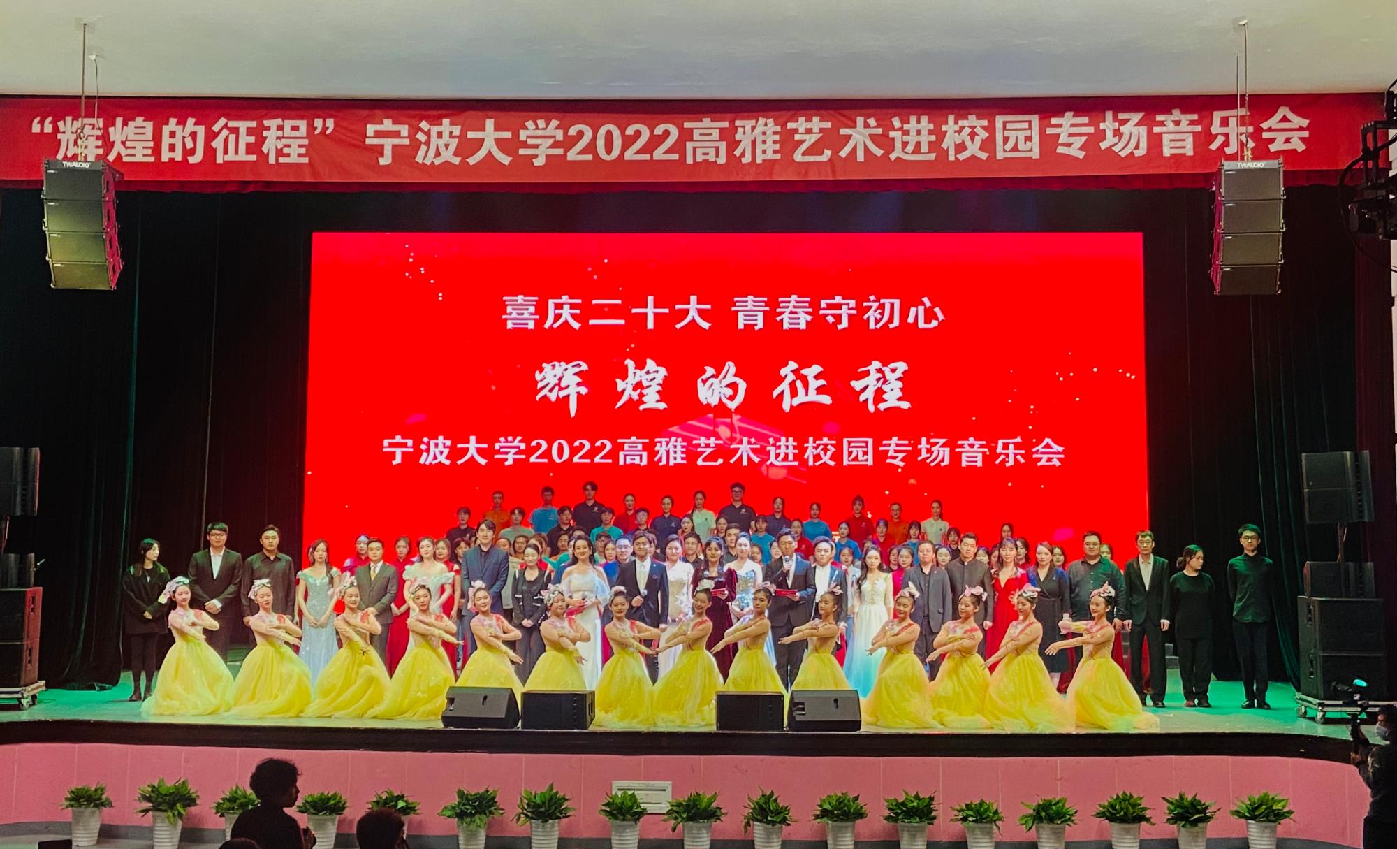喜庆二十大,青春守初心。10月26日,为庆祝党的二十大胜利召开,宣扬二十大精神,进一步丰富师生校园文化生活,弘扬社会主义核心价值观,引导感受中华传统文化的魅力,接受爱国主义情怀的熏染,夯实文化自信之基,提振民族复兴精气神。由浙江省教育厅主办、宁大师生倾情演绎的“辉煌的征程”高雅艺术进校园专场音乐会在麻豆在线