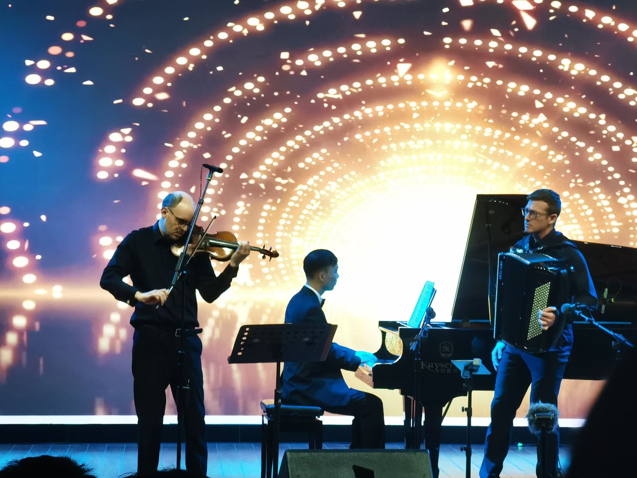 白冰老师一起为观众呈现了兼具爵士音乐风格和古典音乐特色的《角鲨》。音乐会在意大利手风琴演奏家西蒙·赞奇尼与单簧管演奏家加布里埃尔·米拉巴西共同演绎的《意大利罗马涅舞曲》等乐曲中到达高潮。