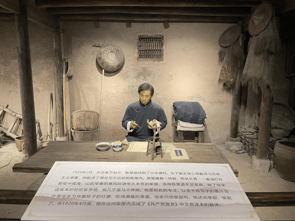 在故居讲解员的带领和解说下,全体党员沿着信仰之路来到了陈望道故居。走进望道故居,正是在一间小小的柴房里,陈望道翻译了一部"改变19世纪以后人类历史"的经典著作——《共产党宣言》,照亮了中国革命前进的道路。故居记录了陈望道先生的生平事迹、学习生涯和工作的点点滴滴,收藏着《共产党宣言》不同版本的珍贵藏品,在那个急需思想解放意识觉醒的年代,即使错版也被“一抢而空”,彰显了信仰的力量。
