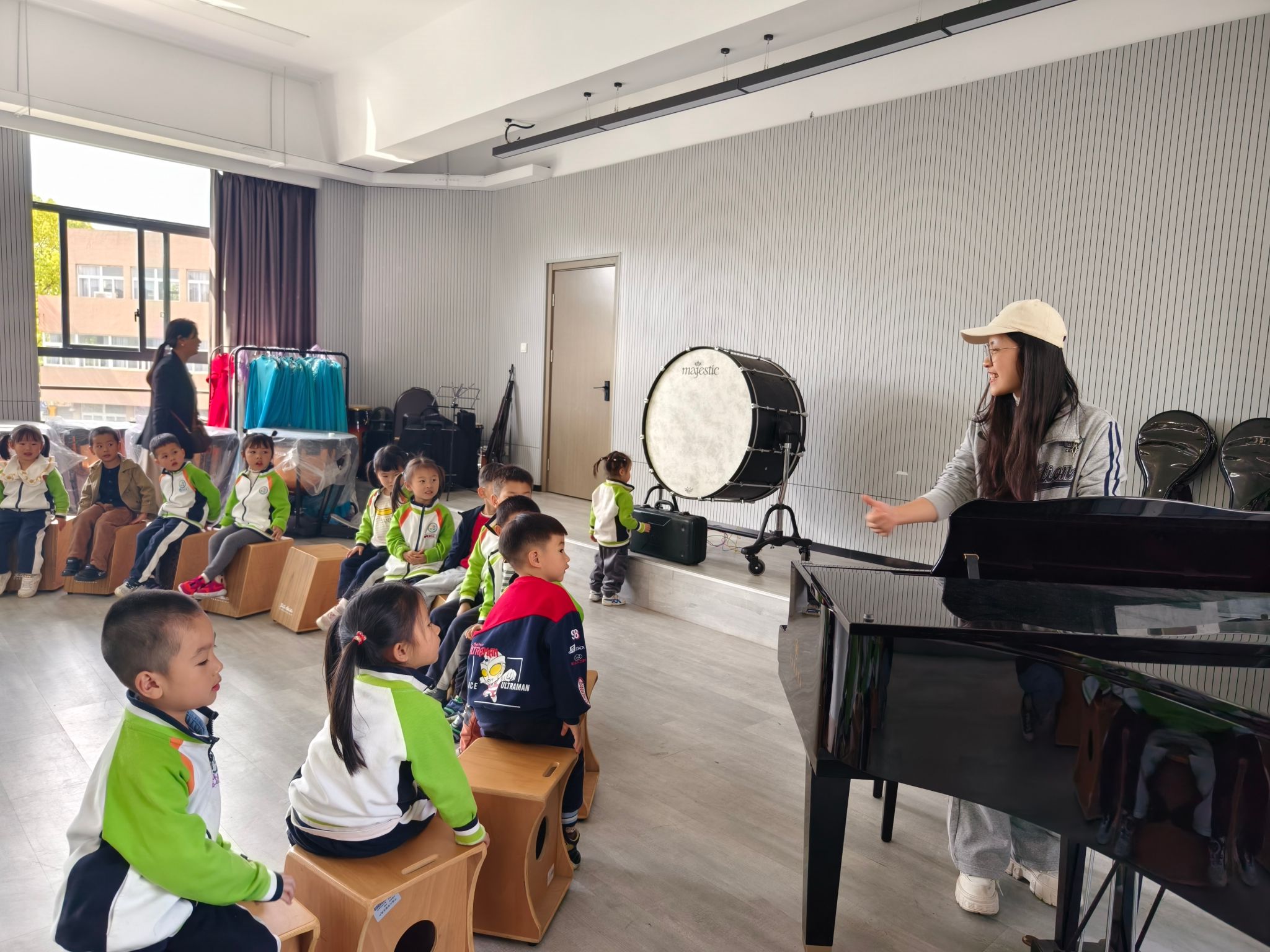 随后,学生党员们向小朋友们介绍了几种奥尔夫乐器,并让他们亲自尝试演奏。小朋友们一边好奇地抚摸着乐器,感受着它们独特的音色和质感,浸润式地体悟传统乐器和文化的美与力量,一边认真倾听箱鼓的发明和改进过程,聆听一曲曲热情洋溢的乐曲。