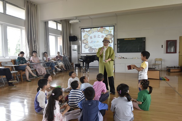 的副院长、副教授、省“三育人”先进个人、省师德先进个人王蕾老师主讲。王蕾老师首先邀请小朋友们一起学唱“你好”歌,让大家互相认识;接着让小朋友们各自挑选乐器一件并讲解该乐器名称以及使用方法;最后,王蕾老师带领大家通过身体的各种动作去体验、塑造和表达音乐的本质,在游戏中培养音乐知识与素养。