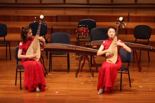 我院优秀研究生代表刘仪和本科生代表徐鑫阳演奏琵琶二重奏《敦煌乐舞图》