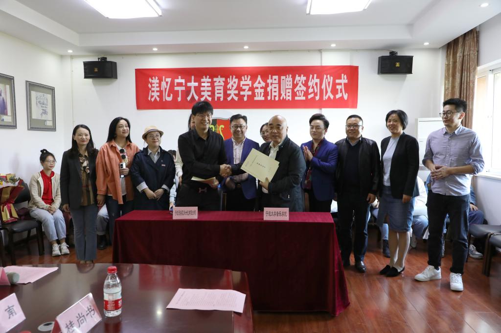 美育教育中心与宁波漫睿霓尚女包有限公司签订“渼忆宁大美育奖学金”捐赠协议。我校俞子正、李国平、屠春飞、桂尚书、王蕾等人,及美育教育中心老师代表与麻豆在线