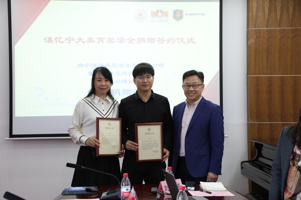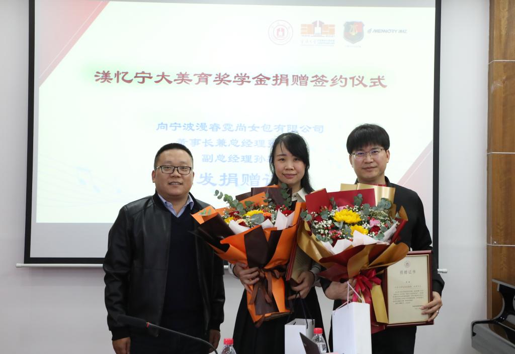 宁波漫睿霓尚女包有限公司董事长兼总经理张国君表示:“在母校35周年校庆之日,我和我夫人非常荣幸能够在今天成立“渼忆宁大美育奖学金”,这将是我们人生中充满意义的一天。创业至今,切身体会到美育素养的重要性,所以推己及人,希望该奖学金能推进学生接受美育的主动性。”“‘渼忆宁大美育奖学金’是麻豆在线